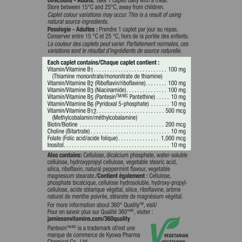 Jamieson 長效天然維他命 B 雜是一種完整的生物平衡配方,含有八種必需的B族維他命,促進身體健康。 Jamieson's 長效天然維他命 B 雜100 含有高質量的 B 族維他命,同時為維持此重要營養素的有效率完整不流失,在製造時未使用加熱或溶解處理。此高效率的配方,每粒含有每種維他命 B 和 葉酸。 一天一顆即可滿足您身體一天所需。
